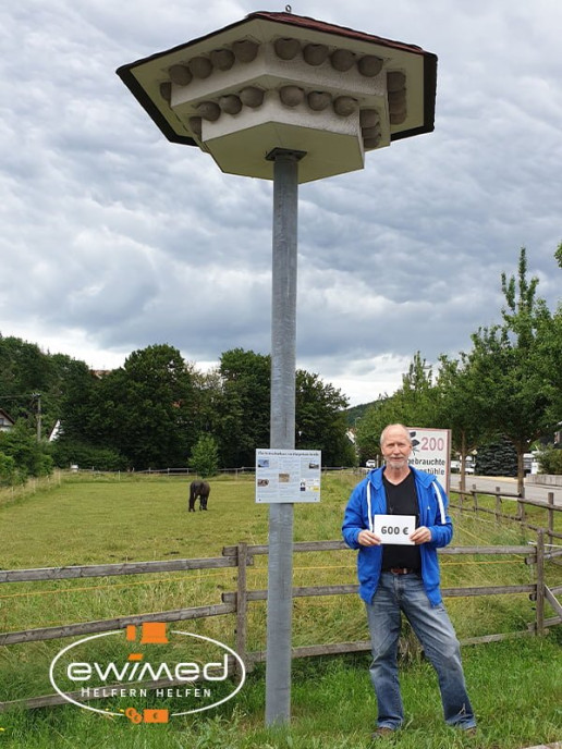 Der Bau von Schwalbenhäusern, wie auch ewimed eines mit der Unterstützung des NABU-Zollernalb auf dem Firmengelände hat aufbauen lassen, der Umbau eines ehemaligen Wasserhochbehälters in ein Fledermausquartier und der Bau einer Nisthilfe für den Weißstorch. Diese und noch weitere Artenschutzmaßnahmen sollen aus dem Spendentopf für nachhaltige Projekte des NABU Zollernalb finanziert werden.